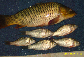 昨天清晨一行三人来到五十公里外的扶风洼里垂钓,是个大型水库,天气多云,到十一点多漂下沉,喜获一鲤鱼,称后有四斤。后来仅获几条鲫鱼。总之,天气不做美,气压低,鱼在水面上游,否则还有更多收获。
